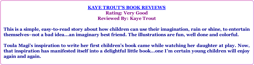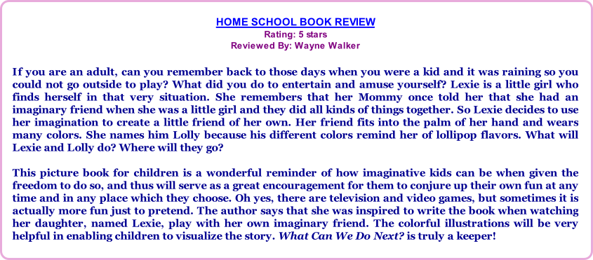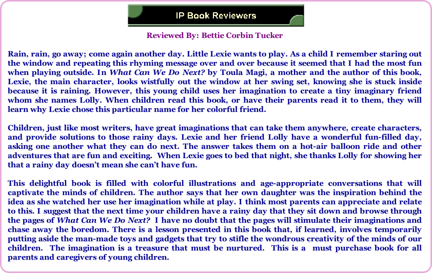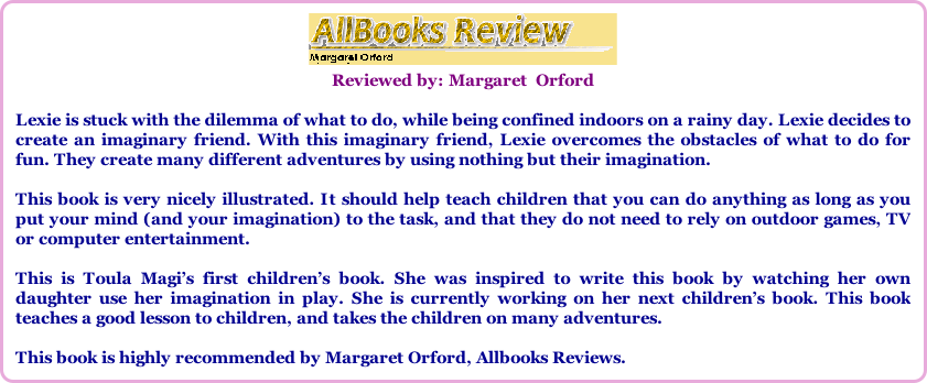 "What Can We Do Next?" by Toula Magi is a delightful book filled with positive messages about the importance of using imagination and exercising creativity, along with the values of friendship and the knowledge about how to treat each other with kindness and consideration. In addition, Lolly promised to be available any time Lexie needed him, and her mother was happy she had him to get through a rainy day. I liked the positivity the story offered about imaginary friends and entertaining one's self. The illustrations were also beautiful and made the story come alive. A great choice for readers young and old that promises to touch your hearts and open your imagination with boundless limits!